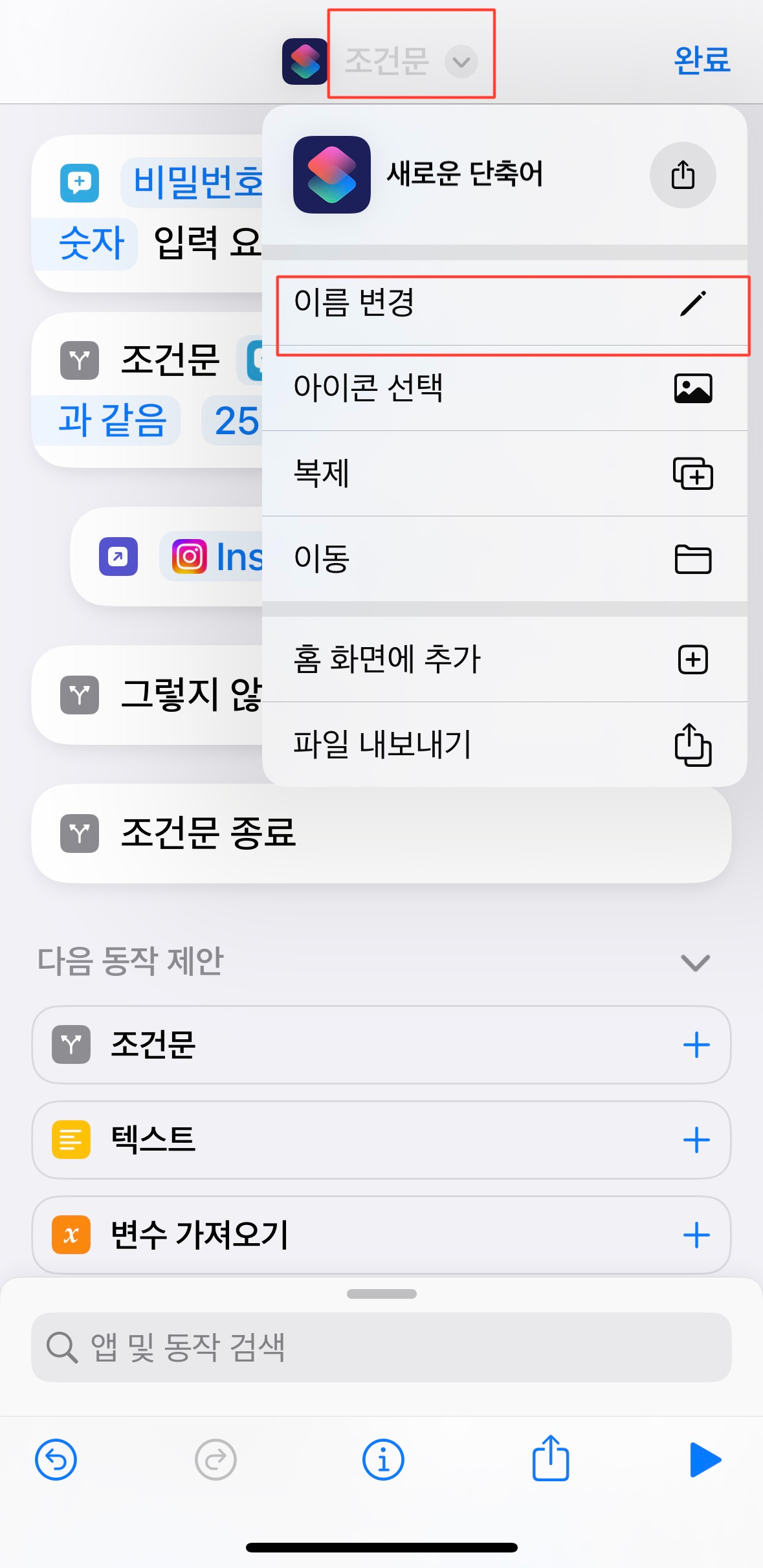 제일 상단에 있는 단축어 아이콘을 클릭하면 이름을 변경할 수 있습니다. [이름변경]을 선택하고 기존의 앱 이름대로 바꿔줍니다. 이름변경 후에 아래에 있는 화살표 표시를 클릭합니다.