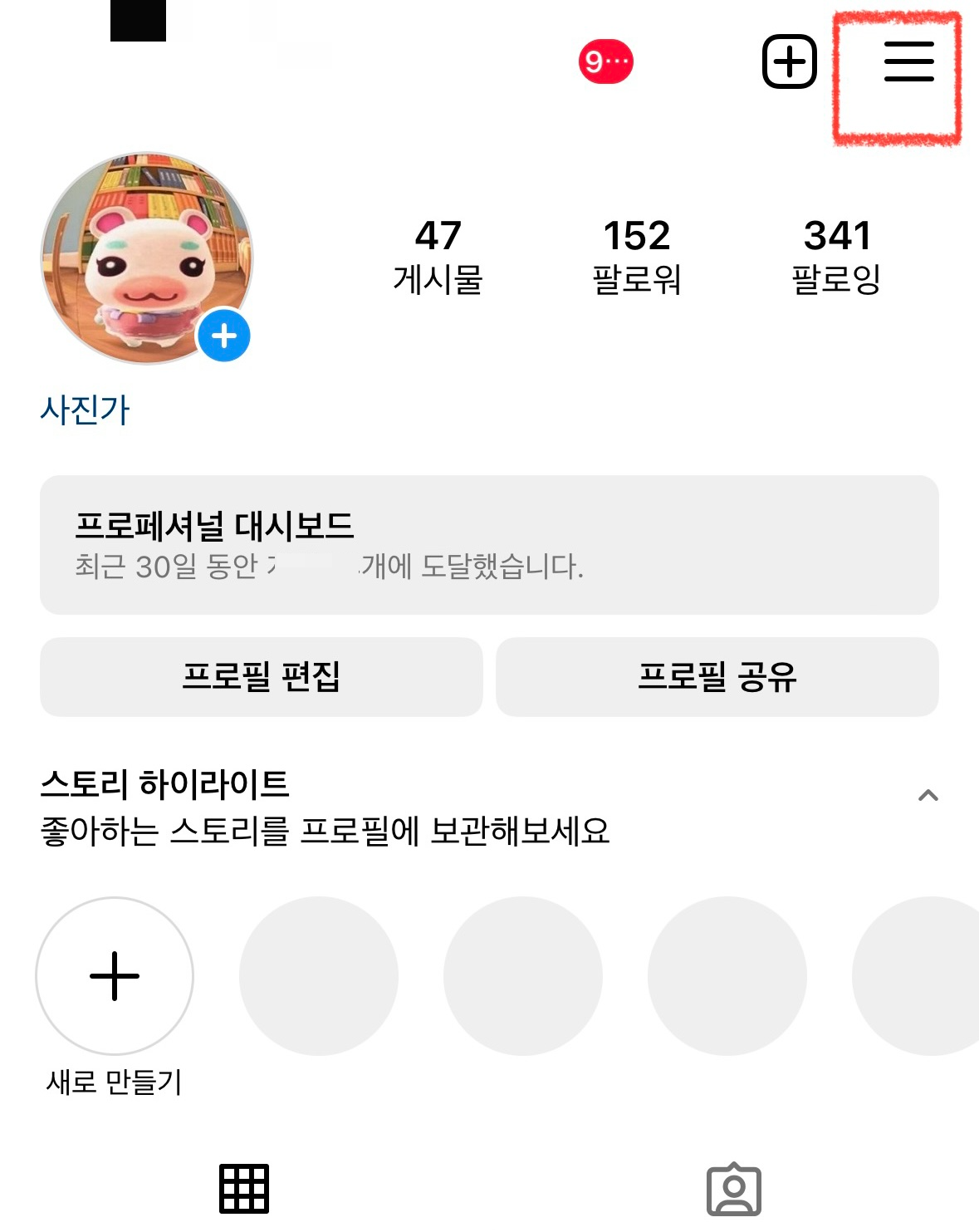 인스타그램 내 프로필 화면에서 상단 우측에 ≡ 모양의 메뉴 버튼을 클릭합니다.