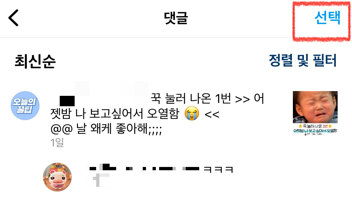 자동으로 최신 댓글 순으로 나오게 설정되어 있습니다. 상단 오른쪽에 선택을 눌러줍니다.