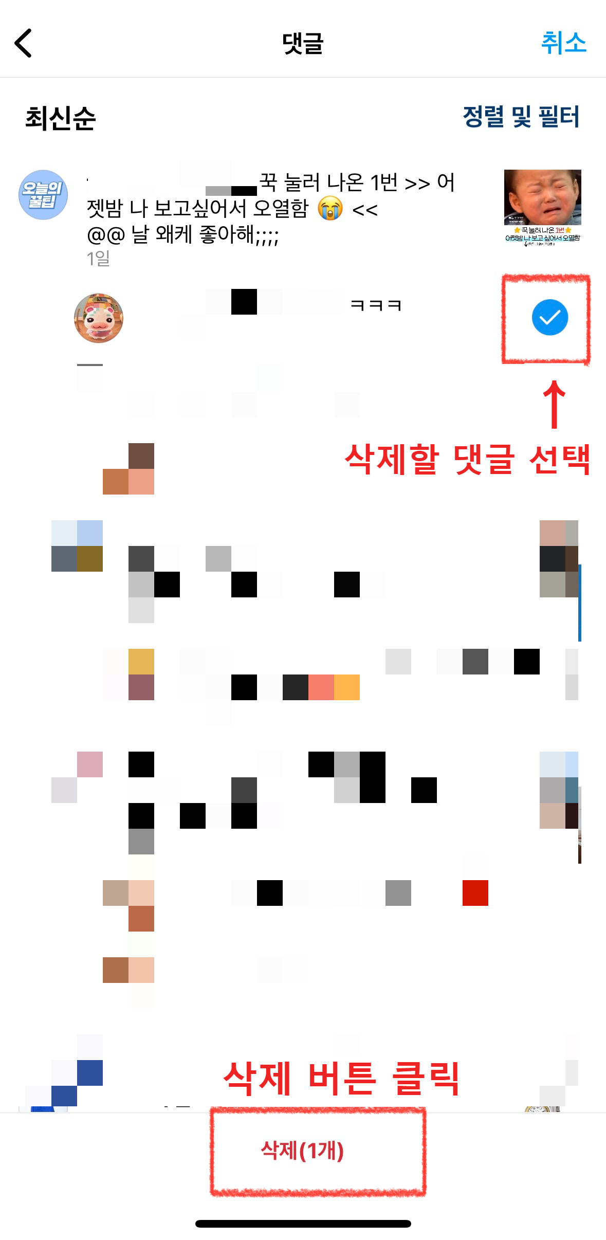 삭제하고 싶은 댓글을 확인한 후 선택합니다. 그리고 아래에 있는 [삭제] 버튼을 클릭합니다.