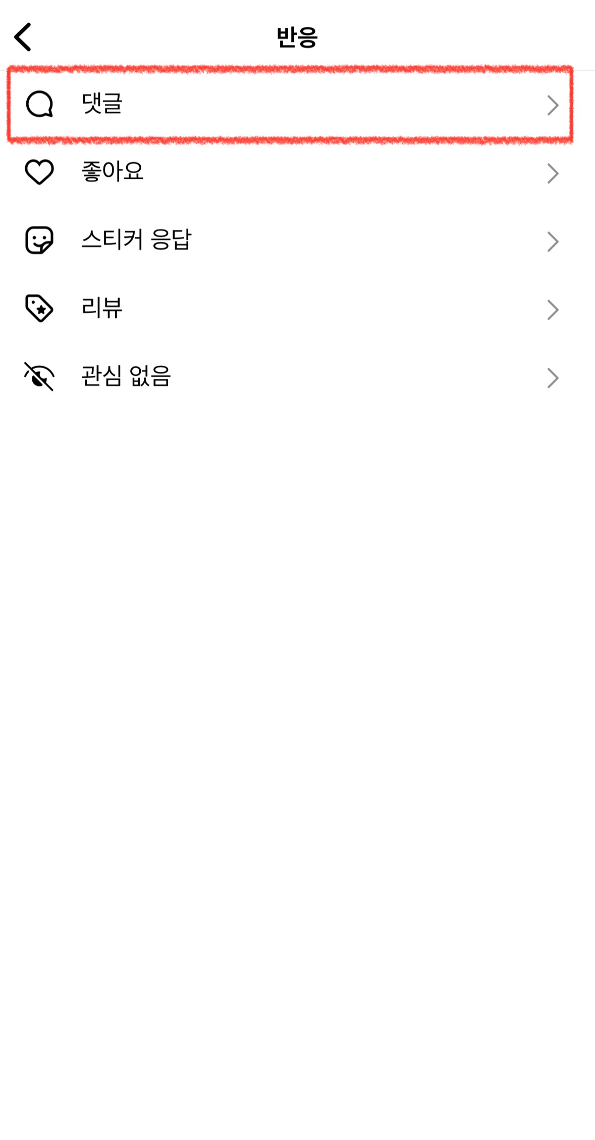 인스타그램 좋아요, 댓글과 같은 반응을 검토하는 페이지인 [반응]을 클릭한 후 [댓글]로 들어갑니다.