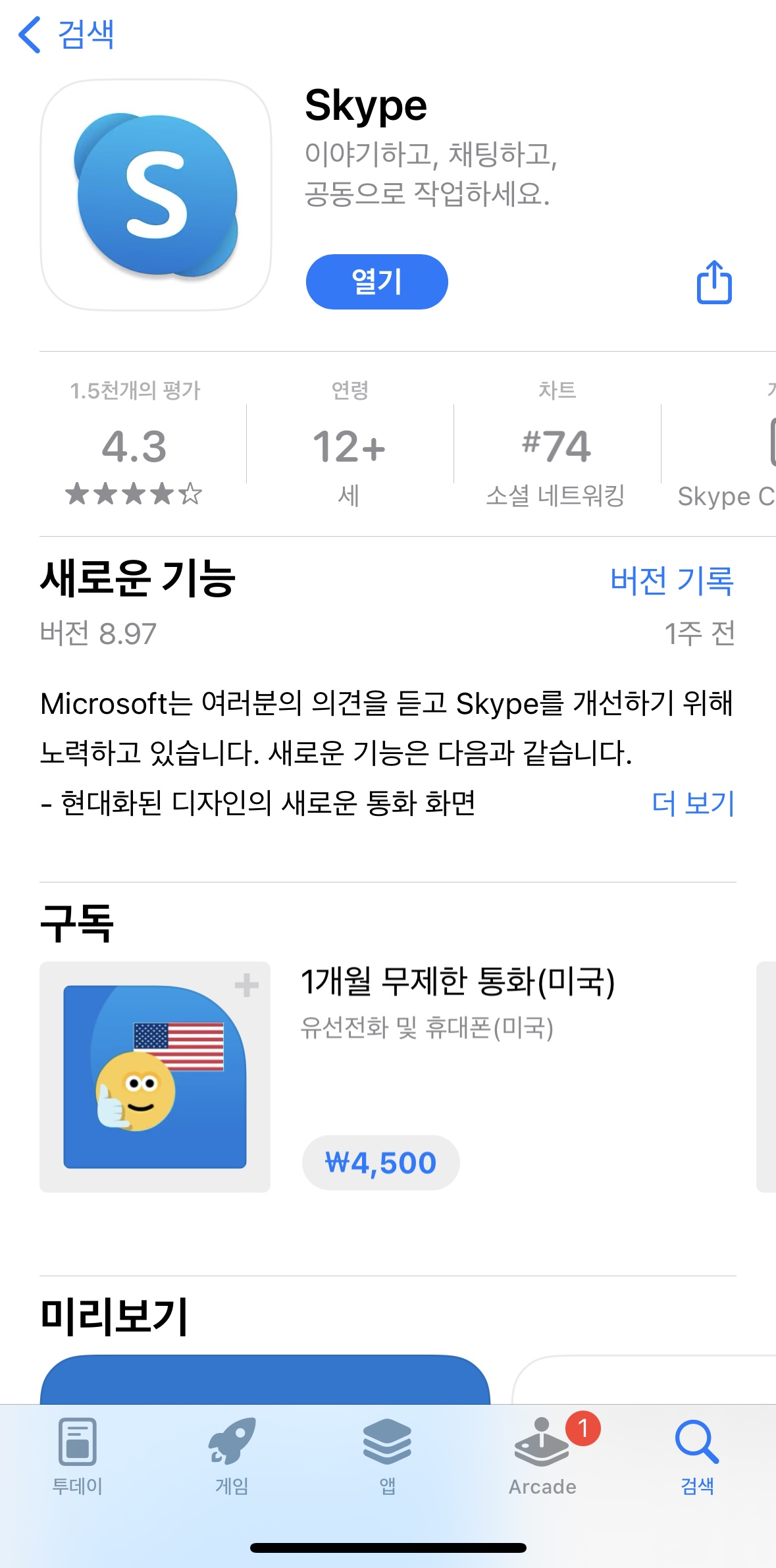 앱스토어 혹은 플레이스토어에 들어가 스카이프를 검색한 후 다운로드합니다.