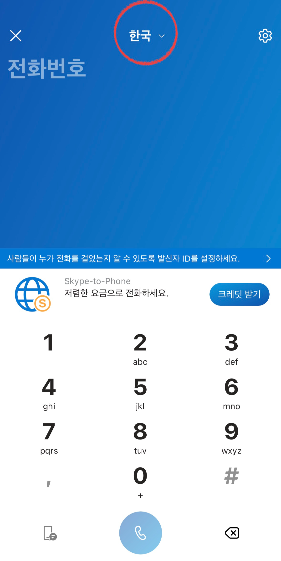 하단 메뉴에 통화에 들어가 파란색 통화버튼을 터치합니다. 통화 다이얼을 누르면 한국으로 자동설정 되어 있습니다. 미국 통화를 하기 위해서 이를 미국으로 바꿔줘야 합니다. 상단의 한국을 터치합니다.