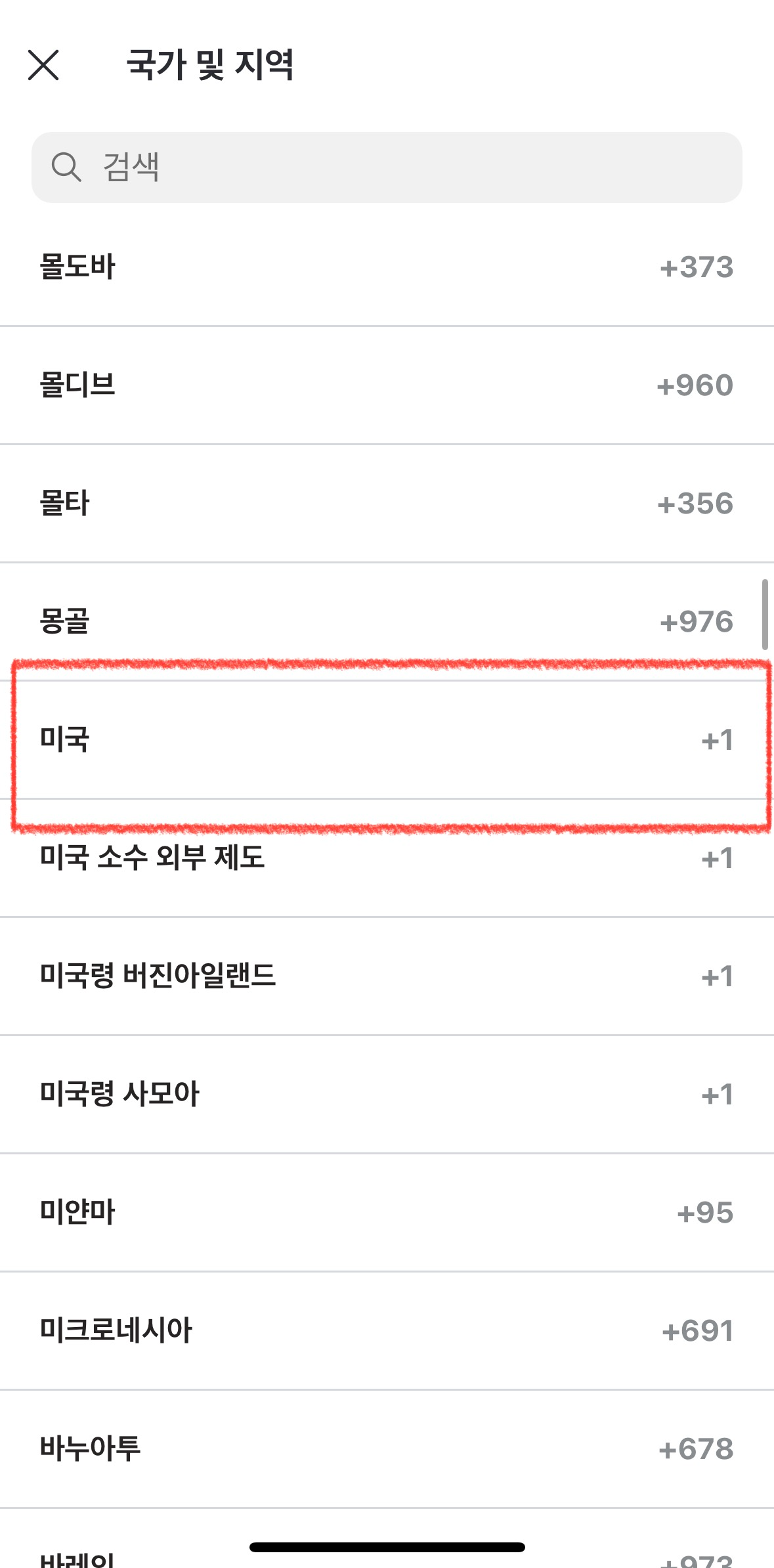 한국 이 부분을 선택하면 통화가능한 다른 국가를 선택할 수 있습니다. 스크롤을 아래로 내려 미국을 선택해서 바꾸어줍니다.