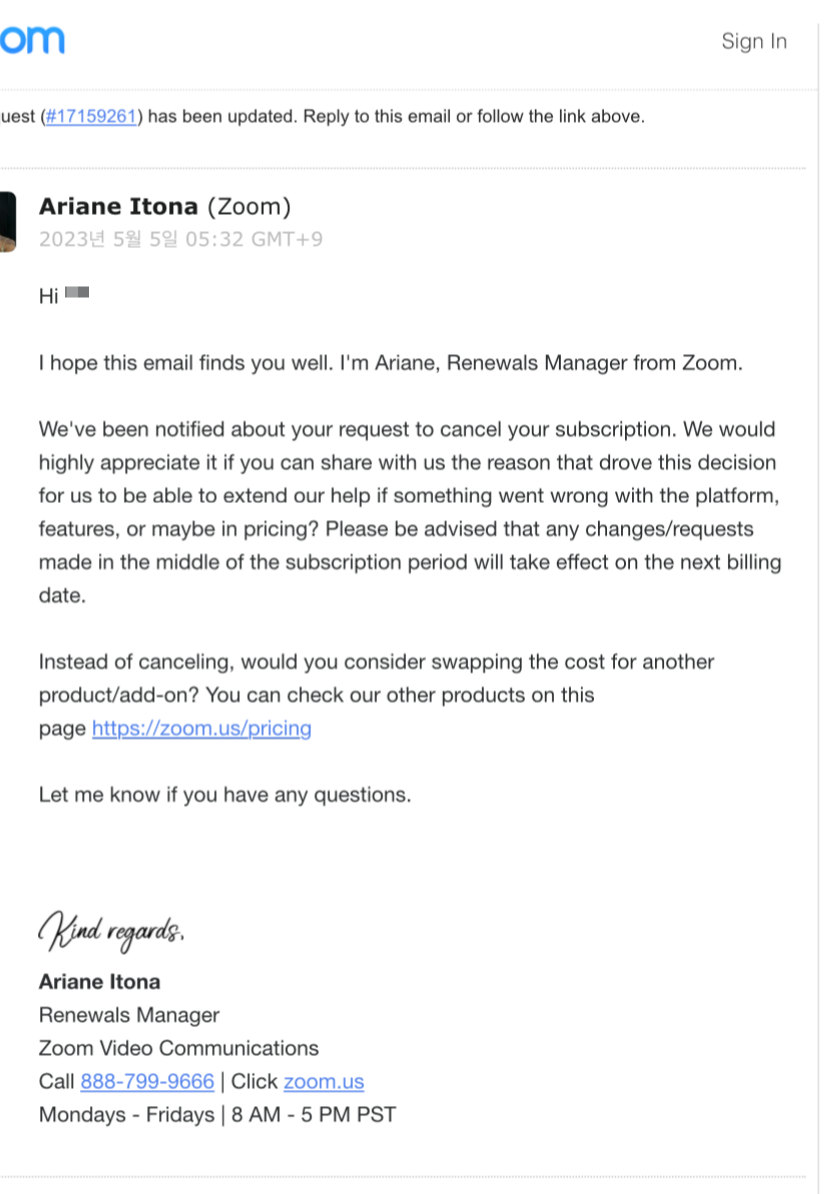 구독취소 및 환불에 관해 사이트에서 할 수가 없어 Zoom 관리자에게 메일을 보냈습니다.